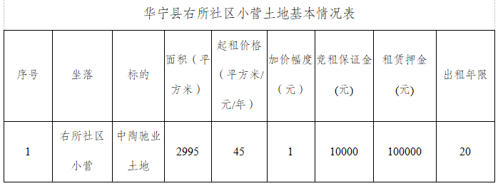 (三)起始价、增价幅度:详细情况见“华宁县右所社区小营土地基本情况表”。